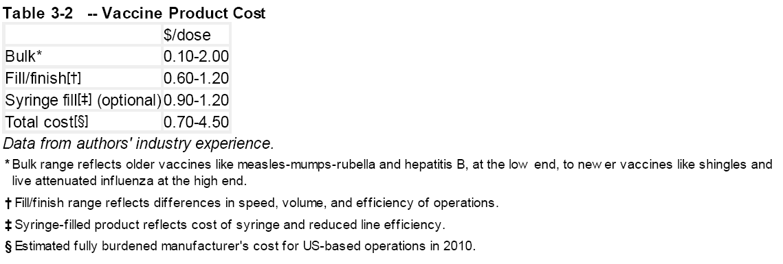 生產工廠造價非常昂貴,根據生產規模、生產復雜性和按照動態藥品生產管理規范(current goodmanufacturing practices,cGMP) 要求用于清潔和工藝驗證的大約20% 額外費用,需要5 千萬~3 億美元。除了少數例外,每種疫苗需要不同的生產廠房,這是因為各有不同的生產要求,不同產品的切換會造成管理上的困難。一些工藝過程是可放大的,像細菌或酵母發酵,因此擴大生產設備( 也就是發酵罐)的尺寸會在很大程度上提高產量,隨著生產規模的擴大單位成本也會降低。其他生產工藝( 如用雞胚和細胞培養生產病毒性疫苗)是不易放大的。為提高產量,就需要建造額外的工廠或者在現有工廠內建造額外的生產模塊,因此隨著生產規模的擴大單位成本不會明顯降低。盡管疫苗批量生產非常復雜,疫苗投產3~5 年后大多數批量疫苗的全部成本下降到每劑10 美分以下,而且產品成本主要與灌發、封裝和包裝有關,對于生產廠家有限的成熟疫苗,能夠在整個產品周期保持很高的利潤空間。