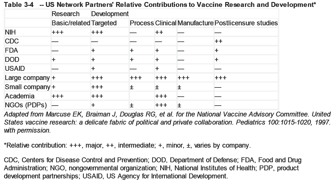 cine Initiative)、瘧疾疫苗行動組織( Malaria Vaccineative)和Aeras(致力于開發結核病疫苗)等多個組織提供了大量資金,用于研發那些可能對發展中國家產生重大影響的疫苗。此外,PATH(Programs for Approprivate Technology in Health) 也是一個非營利的相關組織,專門為發展中國家研發疫苗技術面打造私有組織之間的合作關系。這些產品研發合作伙伴組織( 實際上是非營利性生物技術公司)不但為其生物技術和大型制藥合作伙伴帶來了專業知識、動物模型、免疫檢測方法和疫苗試驗基地,還提供了降低科技風險、機會成本和金融風險的早期資本投資。此外,他們還提供驗證新型疫苗技術和平臺的機會。能夠提供全方位服務的大型疫苗公司的主要作用是疫苗研發。他們的基礎研究有限,但對特定生物的針對性研究較多,優勢主要在臨床和工藝開發方面。工藝開發和化學工程的技術和人員主要在這些公司,而無其他來源。符合FDA標準的臨床試驗幾乎全部由這些大公司完成,而這些項目的早期研發往往由學術界和合同研究組織(contract research organizations,CROs )完成。這些大公司還具備臨床研究、監管事務、數據管理、統計、項目管理以及其他所需學科的技術和人員?;蛟S更重要的是,這些公司的管理是結構化的,能夠迅速做出是否繼續研發的決定。這是降低風險和評估有效疫苗開發所必需的。