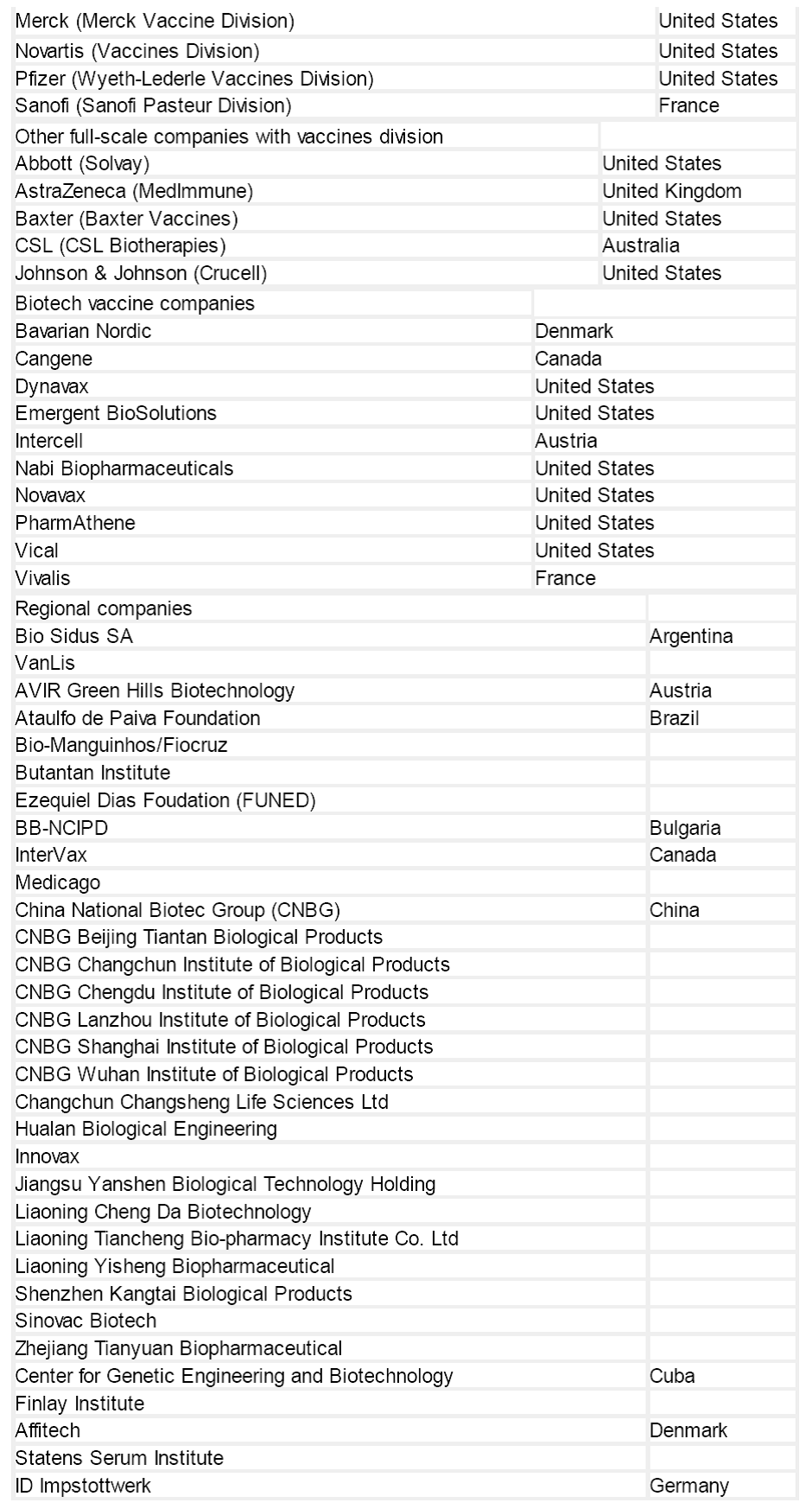 疫苗產業由許多公司組成,主要包括從事疫苗的研究,開發,生產,銷售和配送等任一環節。公司主要從產品銷售和前景預測獲得回報。疫苗產業規模較小但持續增長。2010年全球疫苗銷售額估計超過250億美元。雖然50多個國家都有疫苗企業,但大型疫苗公司主要位于美國和歐洲,根據銷售收入,這些跨國公司占據了疫苗市場的主導地位,但根據疫苗產量,地區性公司的市場份額在逐年增加。